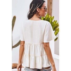 Cute babydoll short sleeve top. Light weight soft knitted fabric shapes this top with a round neckline, flutter short sleeves, and relaxed tiered babydoll silhouette.