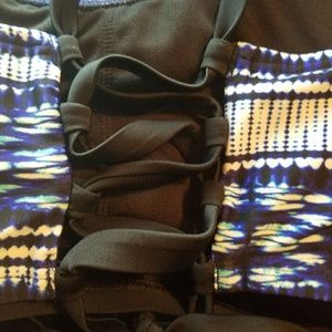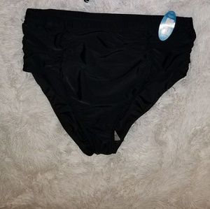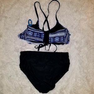 Boutique swimwear 2 piece black, blue & white with underwire and roushing on the bottom flounce top with lace up back
