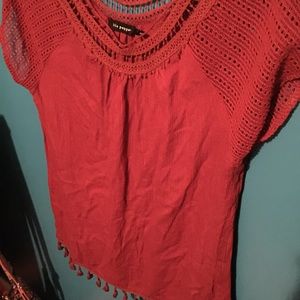 Deep red color. From the boutique I work at. Worn once. Loose fit. Size large
