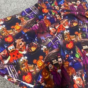 This casual dress features a lively Halloween-themed pattern with orange pumpkins and purple bats on a dark background. Its full circle design ensures a playful twirl, making it perfect for festive occasions. The consistent print and rich color palette add a touch of seasonal charm. Perfect for Disneys Mickey not so scary Halloween. Thicker style material. Custom made