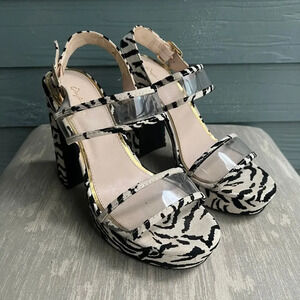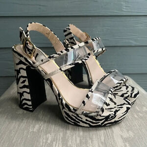 Boutique Qupid tiger print velvet cream & black open toe platform heels. Two semi-sheer foot straps, back ankle strap with gold hardware closure. 1" platform with 4" chunky heel. Barely worn, in excellent condition. Size 8.5.