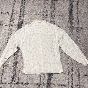 This cream blouse features a sophisticated mandarin collar and a buttoned front, offering a classic and elegant style. The long sleeves add a touch of refinement, making it a versatile addition to any wardrobe. Has a small stain in the back that you can barely see it as shown in pic but it can be treated !! Give your self a vintage style very soft !!