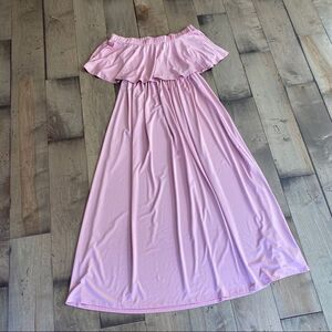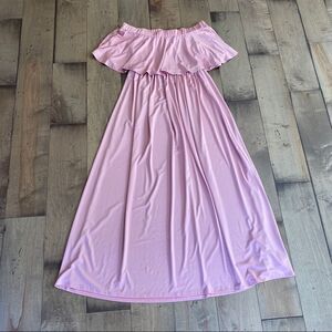 Brand new with tags. Beautiful off-the-shoulder maternity dress - perfect for baby shower, maternity, or newborn family photos. I purchased this last year at an Atlanta boutique, but unfortunately, my shower and photos were cancelled during the height of the pandemic. It's super comfortable, soft, with a great amount of stretch. It's sort of a dusty rose color, but I'm not sure the official color name.