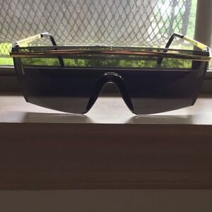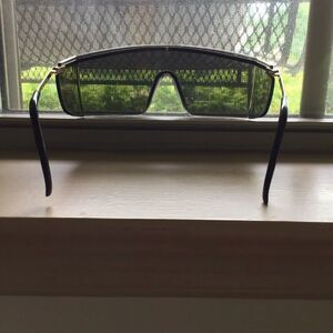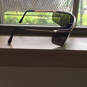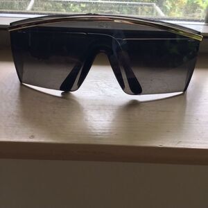 Stylish black shield sunglasses with a sleek gold trim. Perfect for a bold look.