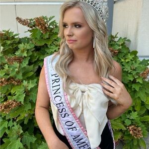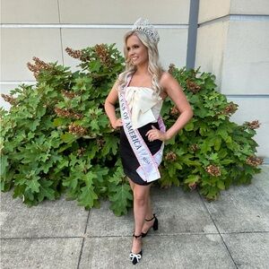 Ivory and Black Bow cocktail. Strapless Dress. Easy to steam. Worn once for a pageant rehearsal. Size small