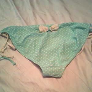 Super cute bikini! Top is covered in bows w/ light blue polka dots and bottom is blue w/ white polka dots and a little bow above the butt. Great used condition. Top is a small and bottoms are a medium.