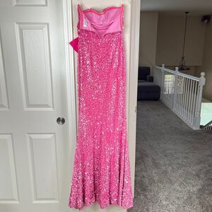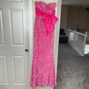 Gorgeous front Pink large Bow all over sequins maxi dress with mermaid on the bottom. Perfect for birthday party, prom, or any special occasions. This dress will have all eyes on you.