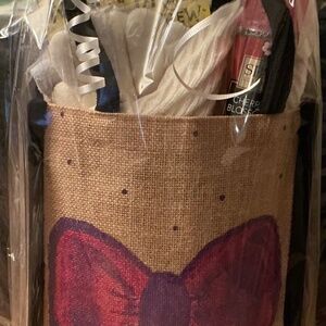 9x4x11 Jute Bag with black handles with a cute bow hand painted and sealed on the front. This bag is perfect for everyday use as it’s durable, and the lining inside makes it waterproof.