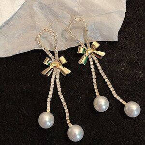 Alloy, Gold Tone Bow Knot Rhinestone Stud Earrings Faux Pearl