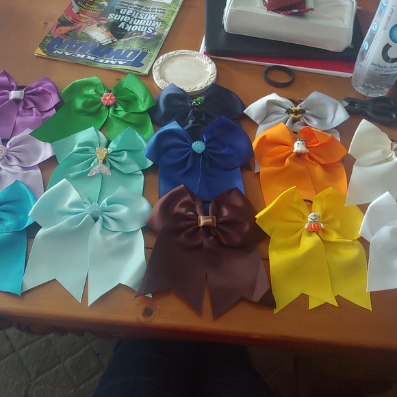 Various color bows with different charms. Super cute for any girl. Themes for Halloween, Mermaids, Flowers, and Candy.