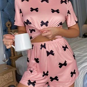 Bow Print Pajamas Set, Short Sleeve Crew Neck Top & Shorts, Women's Sleepwear & Loungewear
