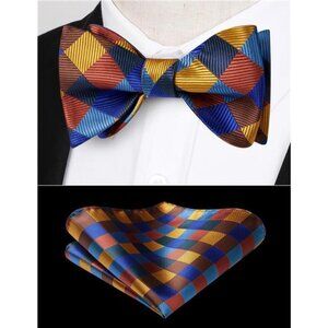 Bow tie self tie for men size: Length x Width: 4.3 x 2.7 inches (11.0 x 6.8 cm); Neck size (adjustable): 13-19 inches (32-43 cm); Total length: 39.4 inches (100 cm); Handkerchief size: 10 x 10 inches (25 x 25 cm); Craftsmanship: jacquard woven bow tie; Package includes: bow tie and handkerchief.