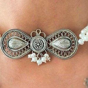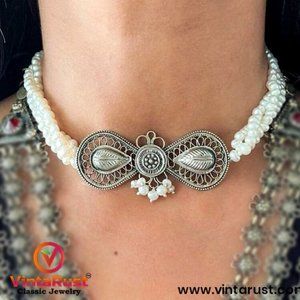 This ethereal ethnic necklace is a classic choker, ornated with pearls and a bow pendant. The light in weight yet elegant vintage necklace is delicately handcrafted by the Himalayan artisans.