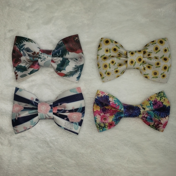 4 Handmade faux leather bow. You can message me to let me know if you want a clip or nylon band. If you dont I will put a clip on it.