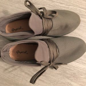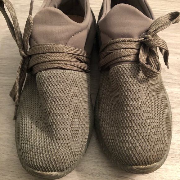 Slip on tennis shoes. They have laces but they are mostly just for the cute bow. Worn only twice. Olive green.