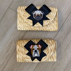 Bow with Bulldog Rattan Straw Clutch, a stylish accessory featuring an adorable dog face patch design.