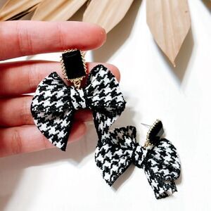 Black and white houndstooth print fabric dangle earrings in gold tone hardware
