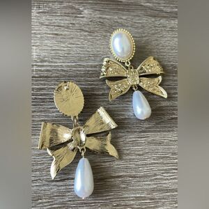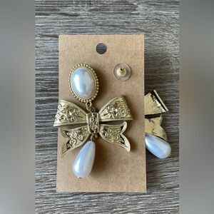 Bohemian bow drop with pearl detail earrings in gold hardware