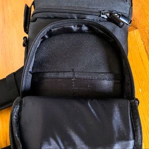 Sling backpack with 3 different pockets. Can hold 1 camera body and 2 lenses. Other pockets can store memory cards, batteries, ect. Like new, rarely used. 7x15”