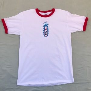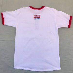 A nineties time machine, this candy cane ringer tee was made for swingers and hepcats. It features '90s fonts, styling, and graphics, with a flaming bowling pin on the front and "ELIAS bowl O' rama" on the back. Pairs great with checkered pants or a soul patch. Very good vintage condition, with just a few barely noticeable marks on the front. The screen printing is pristine!