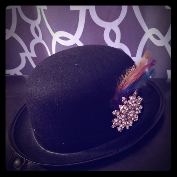 Black bowler hat with broach and feather accent. For derby or cocktail hour.