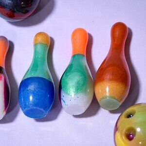 4 pin bowling ball set with 2 balls. Pins and balls are multi color and made from resin. Pins are around 4" tall.
