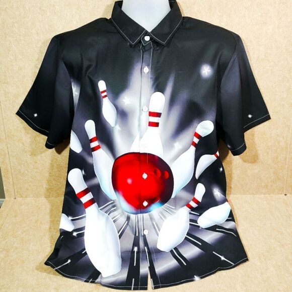Bowling Graphic Black Button Down Short Sleeve Shirt #4
