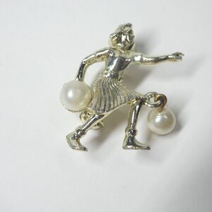 Vintage pin shaped like a woman bowling, with two faux pearl bowling balls.