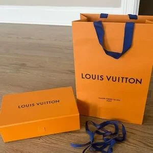 Empty Louis Vuitton branded orange gift bag and matching box. Navy blue ribbon. Size 10.5x7x2 3/4