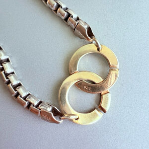 Gorgeous Italian necklace that interlocks (closes & opens) by connecting the two circles by aligning two very small cut openings. Constructed from small square “box” links, creating a clean, geometric, and subtly reflective chain. The box chain is approximately 5.5mm. This sits very close to the neckline for almost a choker/ collar style necklace . This is made out of Solid 925 sterling silver. The Interlocking circles are sterling silver with 18K gold vermeil. Absolutely unique OOAK stunning modern fine necklace.