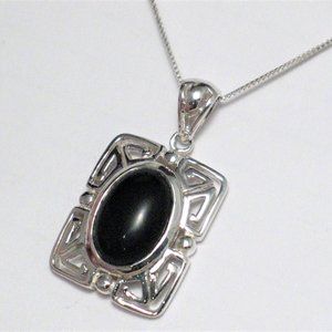 sterling silver necklace pendant set. .7mm, box chain, spring ring closure, hosts a 32 mm Long pendant, well made, rectangular in shape w/ central oval black onyx stone surrounded by ornate filigree design, jointed bail can host most fine to medium chain.. (Here On Pm. I had to add $% on price due to Fees so I can not accept any offers)This item can also be found on my website online at Blingschlingers Jewelry in the sterling silver necklace section