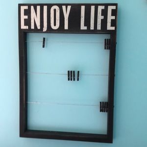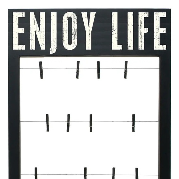A distressed wooden frame with a vintage-chic slogan features clothespins and lines for a fun, innovative way to display your favorite photos.