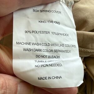 Biscayne Bay King/Cal King Box Spring cover. Light camel in color, machine washable. Looks beautiful on the sides of your box spring mattress. Purchased, but decided on just purchasing a new box spring instead. It has never been used.