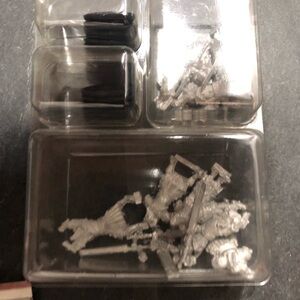 Box of immortal units from the table top role playing gaming Hordes. Box has only been opened for me to look at the models, other then that they haven’t been touched. They are made out of pewter they will need to be cleaned lightly with warm water and dish soap to clean off any release agent that is used to keep them from sticking to the mould they are cast from. Recommended age for use 13 plus due to small parts and pointy parts. Paint will be needed.