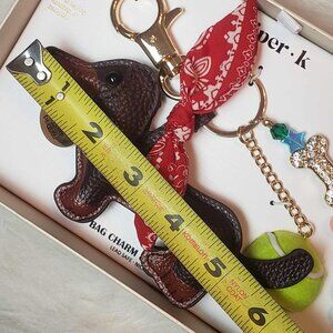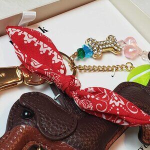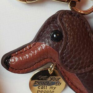 Details: Dress up your handbag, backpack, or keys with this super cute key chain bag charm!! Gold hardware. Features a brown dachshund dog made of a pebbled leather looking material (most likely NOT genuine leather). Dog has a bead eye, and a round gold tag at the neck that says "Get your people to call my people". A red bandana ribbon is attached above the dog for a splash of bright color. Two additional dangling chains feature a yellow tennis ball on one and some beads and a rhinestone dog bone adorn the other. Total length of the dog is approximately 6 inches from nose to tail. Comes in a really cute gift box decorated with paws and bones. From a smoke-free home.