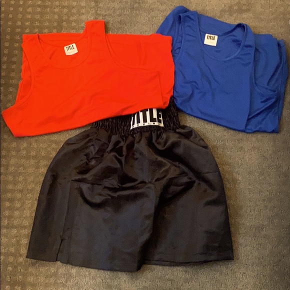 Title boxing shorts and two shirts.