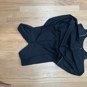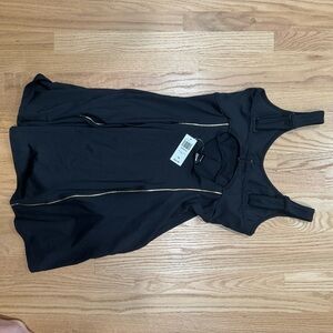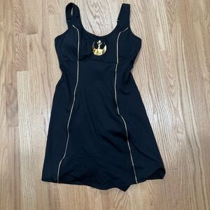 Stylish black dress featuring a gold Rebel logo. Perfect for fans. Adjustable straps, built in bra, and shorts underneath