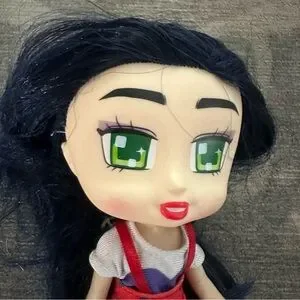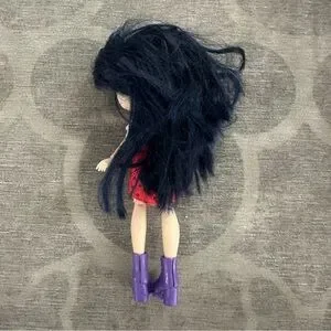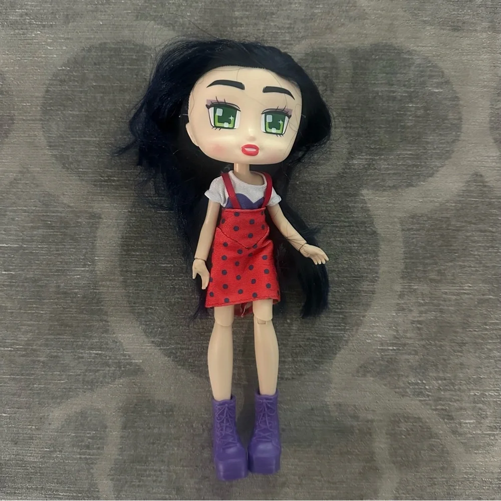 The doll features a stylized head with green eyes and black hair, dressed in a red polka-dot jumper over a grey t-shirt,& purple platform shoes