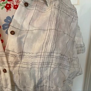 A super cute and contemporary boxy white blouse with brown wooden buttons and a black windowpane/grid pattern in thin lines. Very androgynous. The brand is Roolee and the size is small. Back is longer than the front. Lined. Slight texture to the front fabric. Linen/Cotton. Bust: 25”, Length: 26”, 5.3oz #windowpane #grid #buttondown #androgynous #preppy