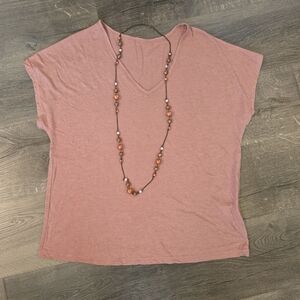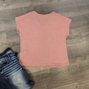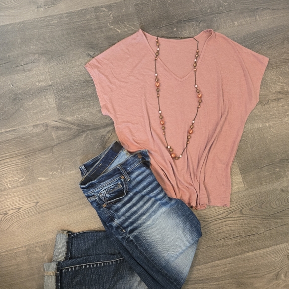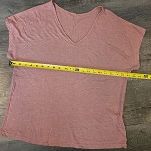 Dusty pink v neck boxy top. Soft and lightweight with over sized sleeve openings to give a flowy feel. In excellent condition. Never been worn or washed. Has no stains or holes. I do apologize for the wrinkles since its been hanging in my closet. Measurements in pictures.