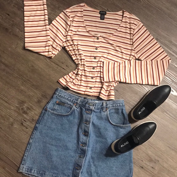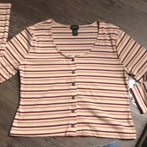 Ribbed, boxy style button up crop top. Long sleeves with stripes. Super cute 90’s, vintage style thats on trend and perfect with your fave high waisted shorts or skirt.