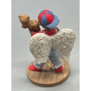 This angelic figurine showcases a young boy with wings, holding a teddy bear and baseball bat. A hand-painted finish enhances the fine resin details.