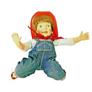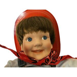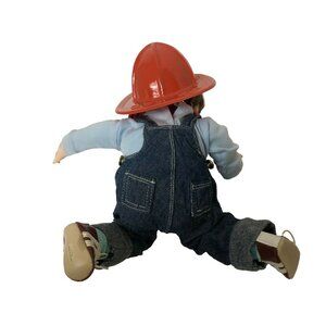 This doll is wearing blue denim trousers with red and black scarf and Red Fire Chief hat