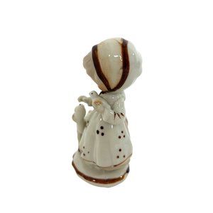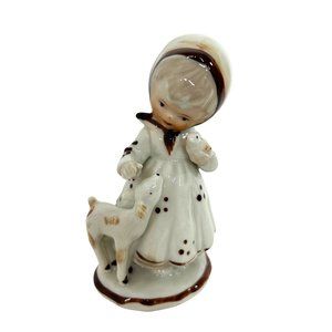 0935A- Vintage boy & girl figurines, porcelain, glazed, bucolic, country, old world, cottage, 5 inches tall, 2.5 inches wide, 2.25 inches deep. Girl has kerchief on head, holding bird, petting deer, apron over long dress, beige, brown, cream. Made in Taiwan. Boy has country hat, holding wheat and carrots, with small fox at feet, apron over pants with pocket with crisscross back. Brown, tan, cream. Some signs of shelf wear on the bottom of the boy statue. Excellent condition. Gently preowned