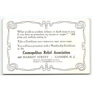Unique advertising post card with custom advertising on the back from the Cosmopolitan Relief Association in Camden, New Jersey. Unposted. Antique original vintage post card. Has some corner dings, and age wear. Stock# pc78.