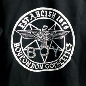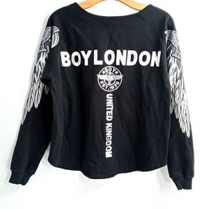 Boy London Black Sweatshirt with Silver Bird Graphic. established 1976 boy London gothics spell out front with Swarovski bird and boy, arms have Silver Bird and feather graphics down the side, scoop neck long sleeves with a cuffed Edge, curved High low cropped hem.