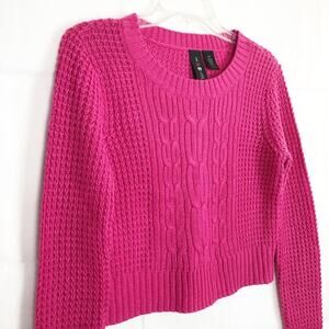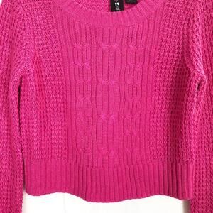 Boy Meets Girl pullover pink crop sweater. Round neck. Long sleeves. Metallic detail. Waffle knit sleeves and back. Boxy fit. Ribbed neck, cuffs and hem. Pre-loved condition. Only worn once. In great used condition. No stains, tears or holes.