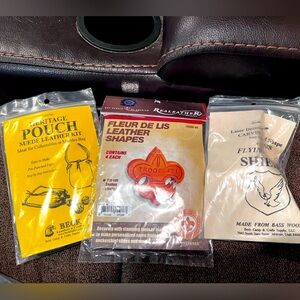 Brand New still in packages, Boy Scout Craft Kits for Leather Pouch, Flying Eagle Shield Neckerchief Slide and Fleur De Lis tooling kit.