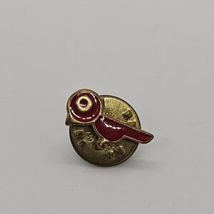 Small vintage gold tone pin with a red enamel bird on it. Related to a Boy Scouts activity for Naturalists. In good used condition.