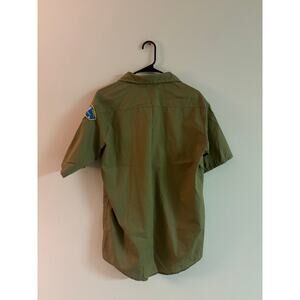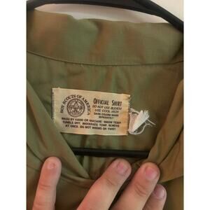 This is an official Boy Scouts of America (BSA) short sleeve uniform shirt in olive green, featuring classic embroidered patches, including council and troop insignias. Made from a durable cotton/polyester blend, this BSA shirt is a great find for collectors, reenactors, or anyone needing an authentic scouting uniform piece.